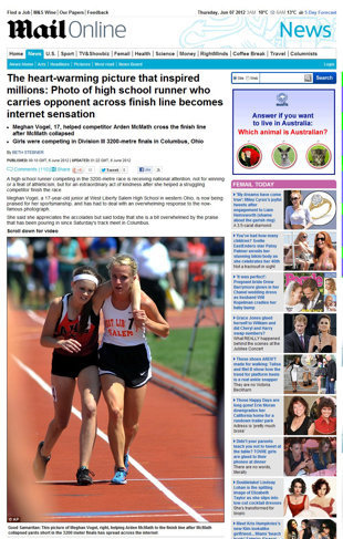 其實那天稍早,梅根已經贏得1600公尺賽跑的冠軍,在體能不堪負荷情況下,她已經決定放棄3200公尺比賽,不過就在她看見前面的雅頓虛弱的快倒地時,立刻跑上前去攙扶,而不是超越她。